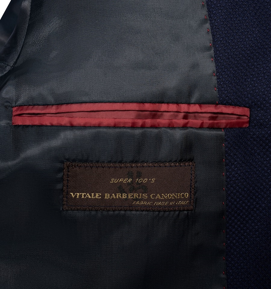 - sacou albastru inchis cu 1 nasture invelit in material, fara slituri, 2 buzunare laterale si 3 buzunare interioare, maneci cu nasturi inveliti in material si butoniere functionale. Rever spit nesatinat.