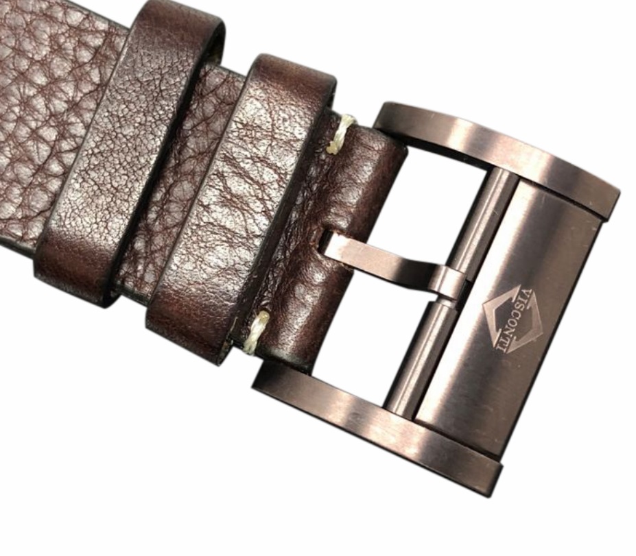 - Curea din piele de aligator cusuta manual, rezistenta la apa; catarama din otel inoxidabil satinat si acoperire PVD maro.